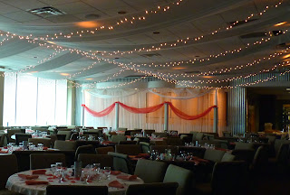 For the reception, we put up our signature dropped ceiling complete with twinkling lights. We also added a backdrop to the back wall.